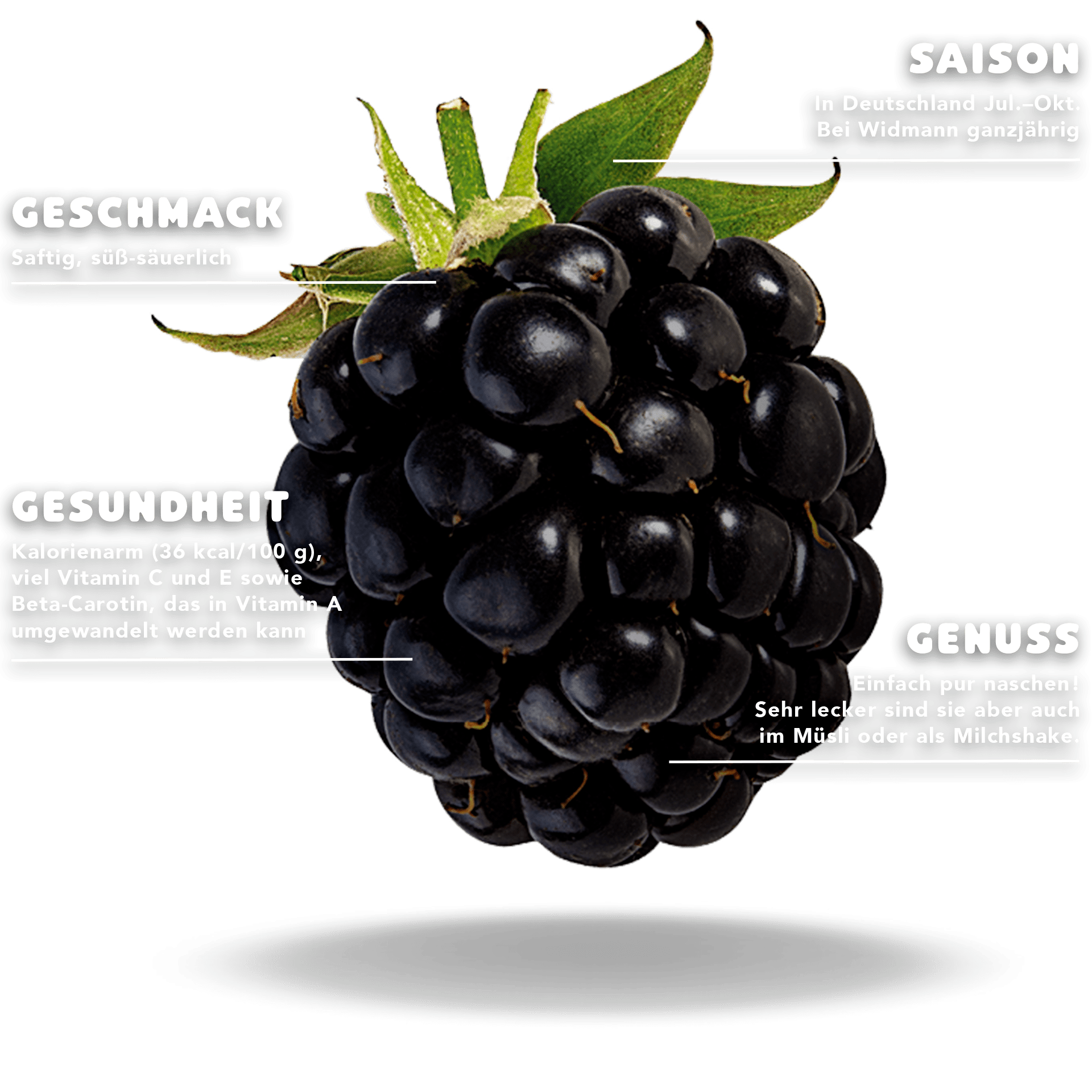 Echte Fans schwören darauf, dass die Brombeere die beste aller Beeren ist. Fakt ist aber, dass nur wenige Sorten geschmacklich optimal sind. Bei Früchte Widmann haben wir natürlich diese im Sortiment. Wie frisch sie in den Handel kommen, erkennen Sie übrigens am schönen Glanz.